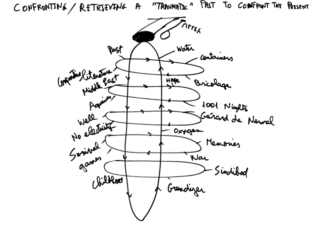 I tabled my memoir and thought of it as a future project, because I was writing a book on monsters, about the idea of the beast wahsh. It was a subject that I had been very interested in for the longest time, and what it meant in language and its derivatives across the region. It means I miss you in Egypt وحشني and in Morocco توحش, which led me to think about al-ins الانس, and the non-ins. I wrote an article on Hoda Barakat and the tawahhush. “The Lebanese Civil War, with its violence and forced exile, pushed authors and artists like Hoda Barakat into the spaces of wihsha or beastly wilderness that al-Shanfara also occupied.” This was my focus, and this was the topic, how it’s used in the community and how it was developing.