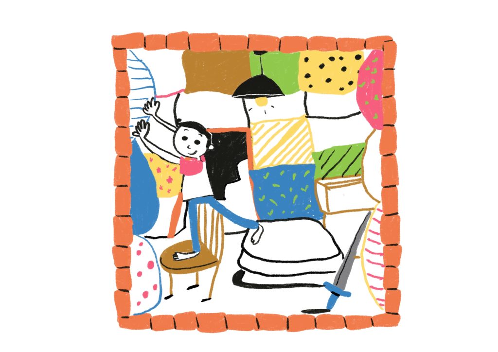 So, he changes the combat area. He walks over to the old shed, hangs puffed cushions and pillows, and attaches them to the wall. He prepares the shed for so it’s ready for next month’s tournament.